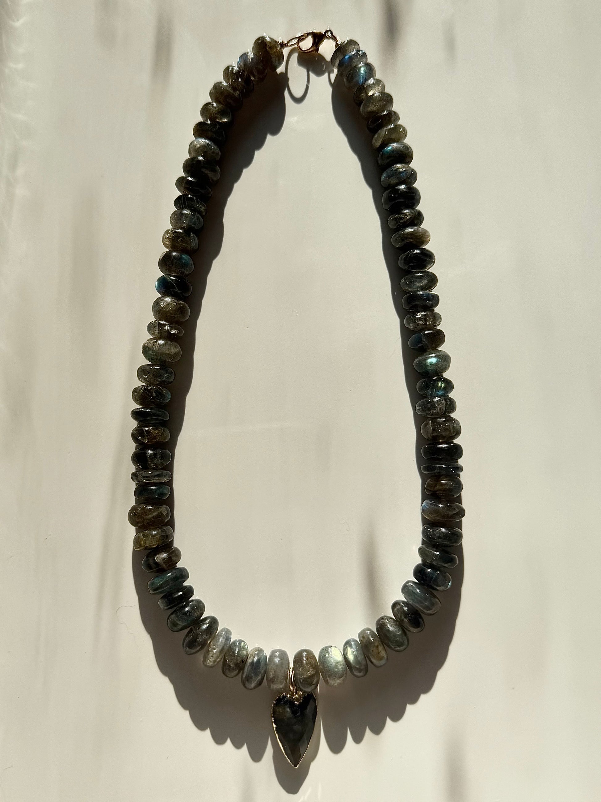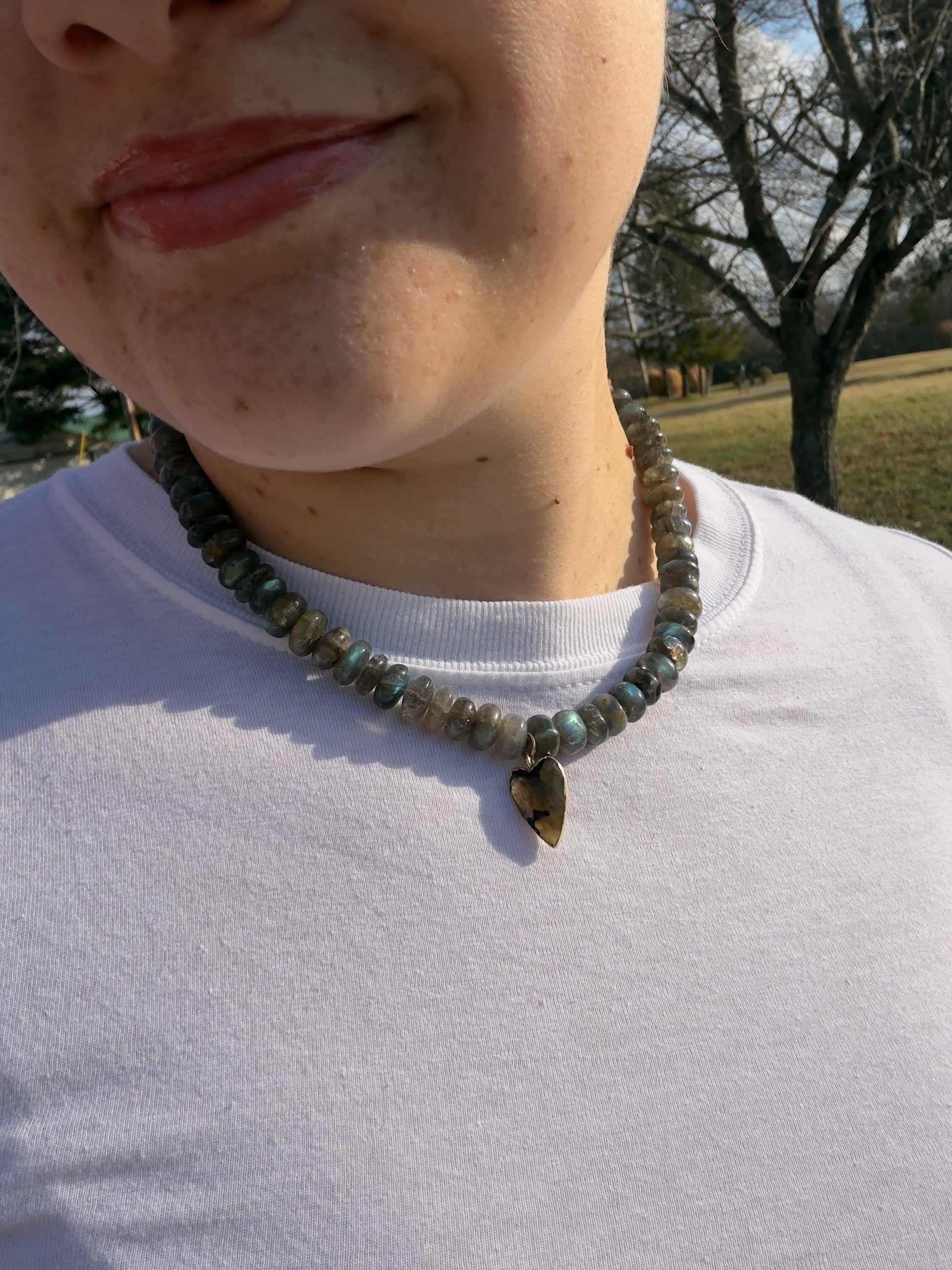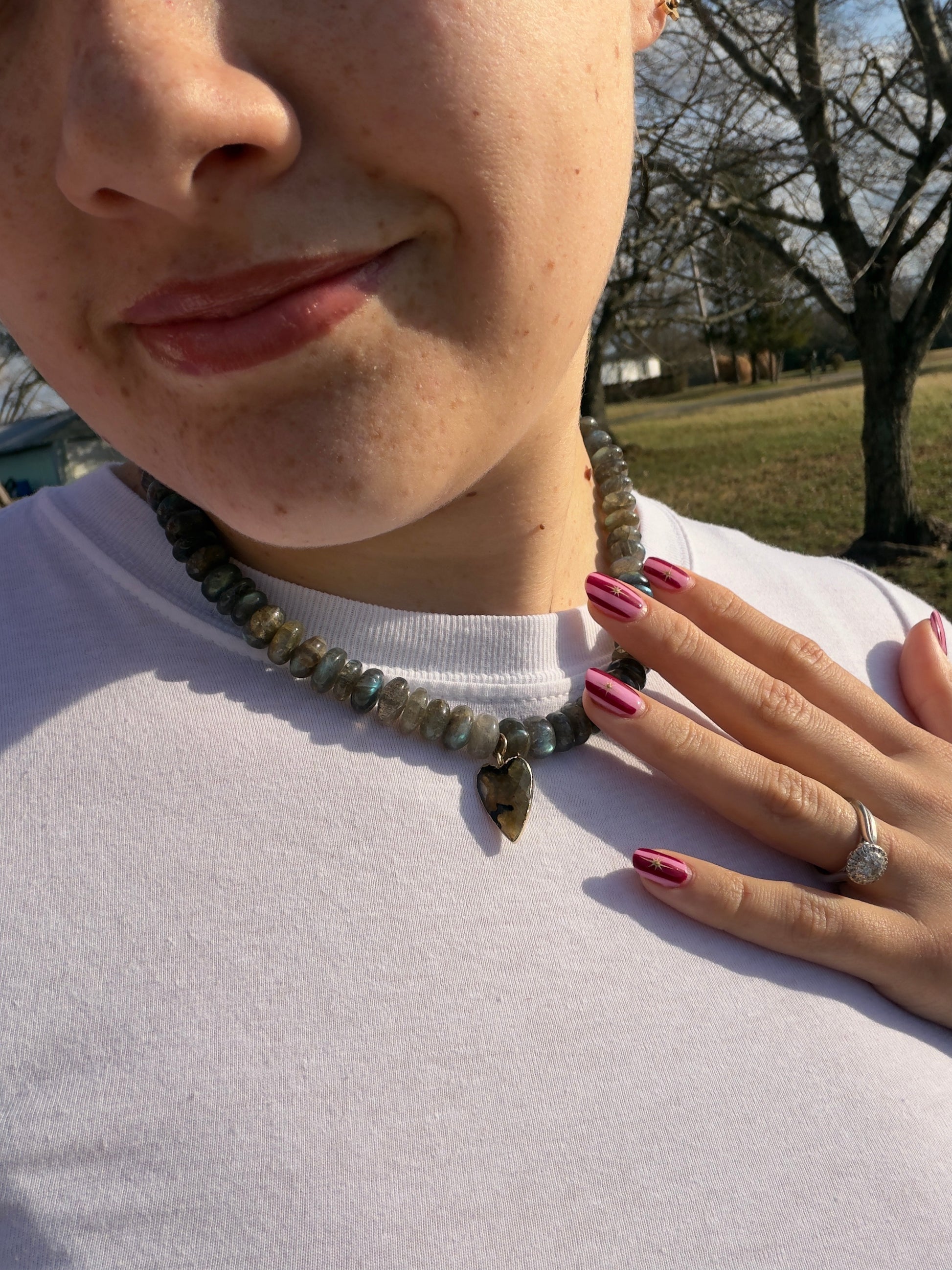 A labradorite gemstone necklace finished with a romantic labradorite heart charm. Shimmering gemstones and warm gold details give this piece a meaningful, heirloom feel.