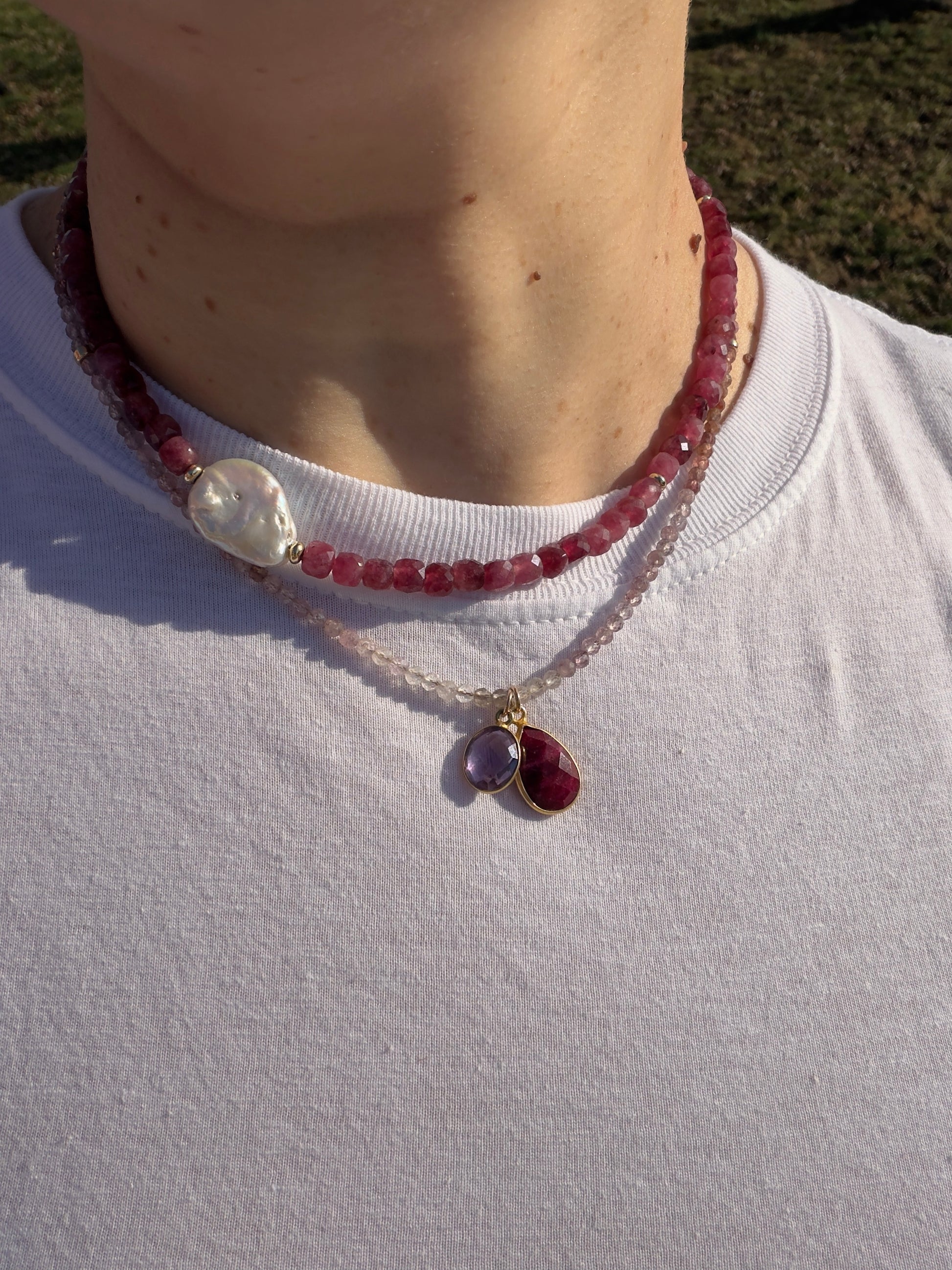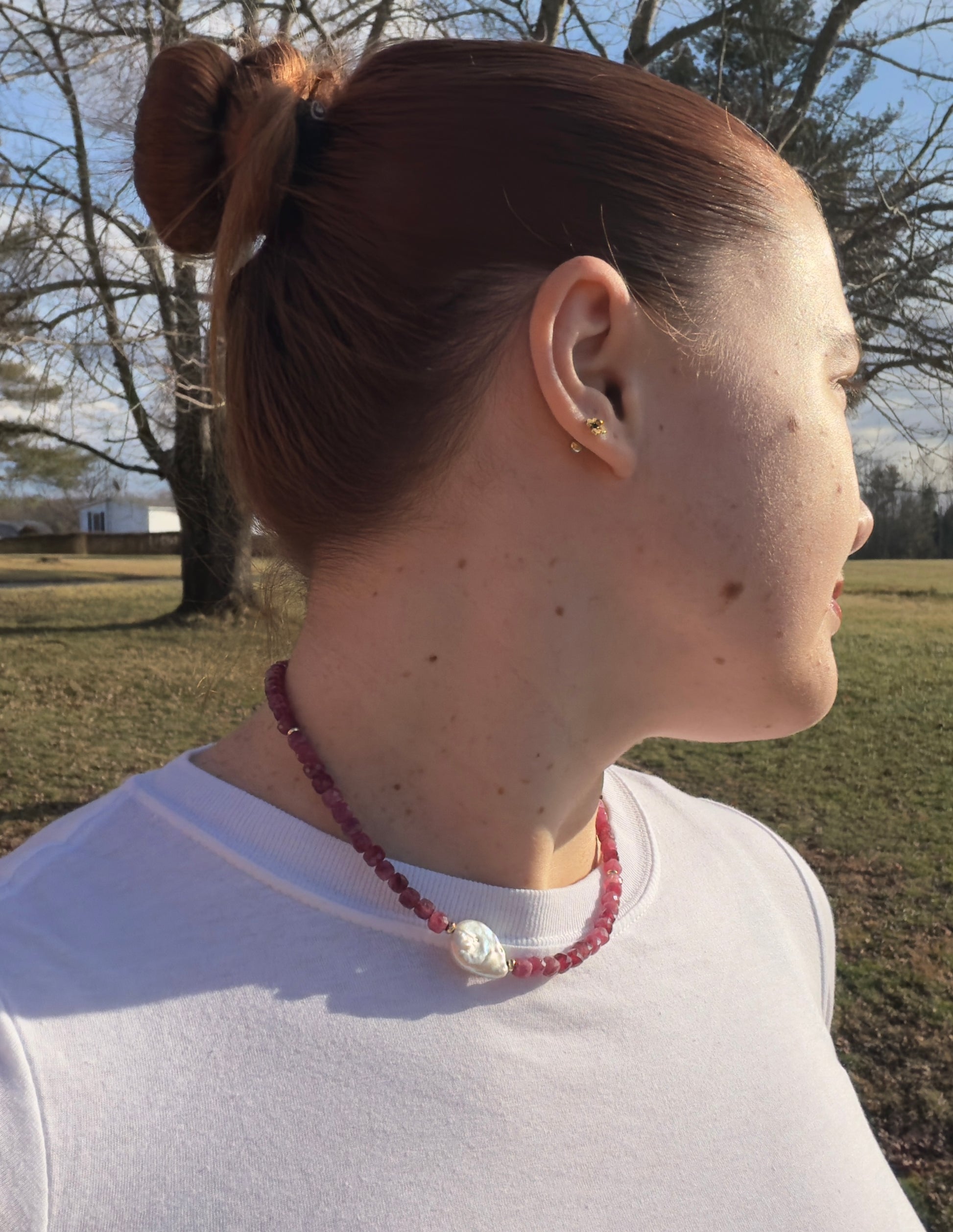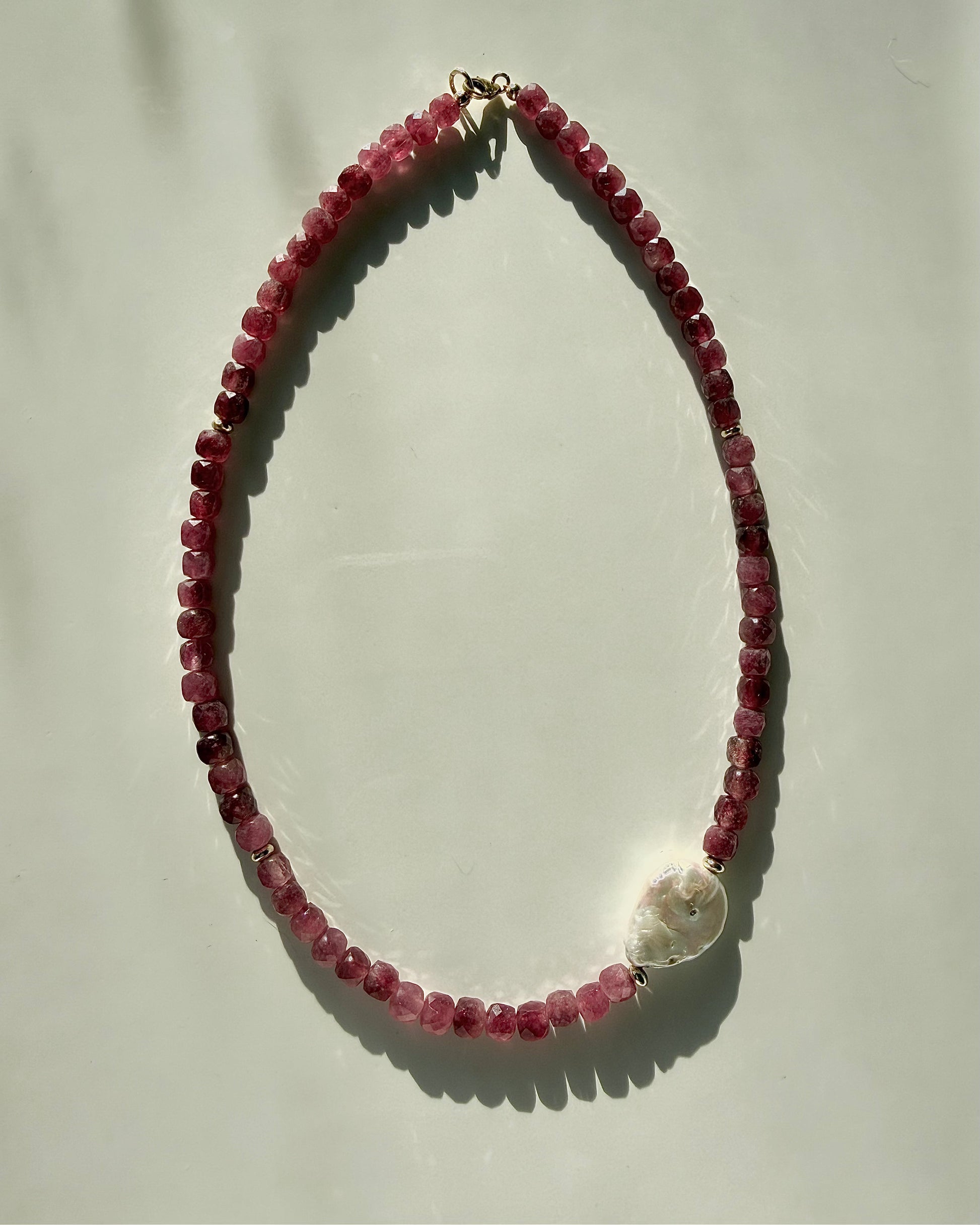 A handmade ruby gemstone necklace featuring a baroque pearl accent. Timeless and sentimental, this heirloom-inspired piece is designed to be worn daily or cherished for special moments.