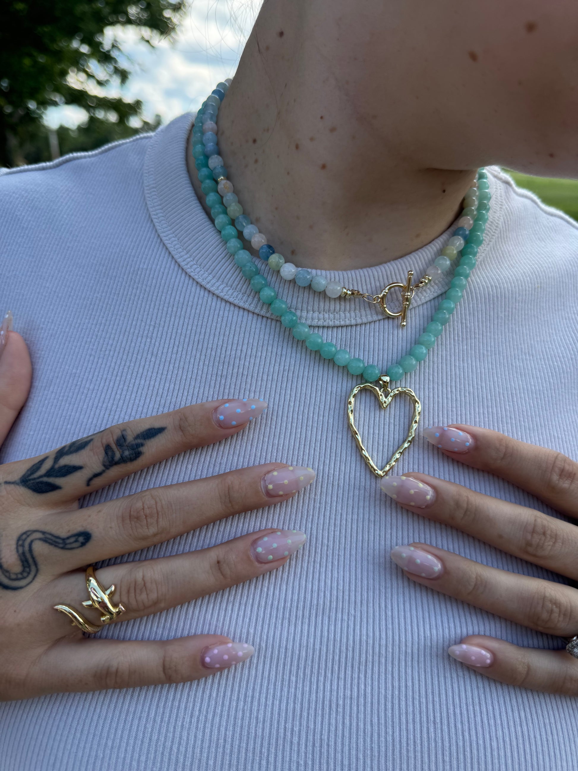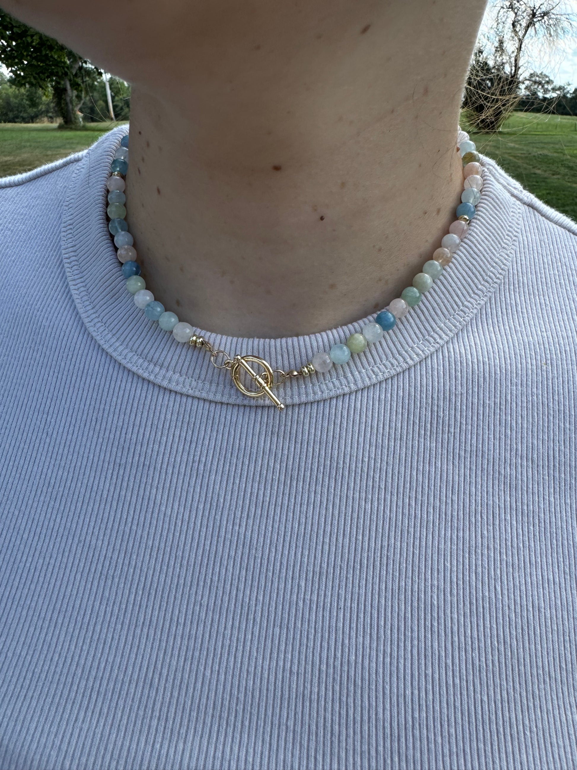 Aquamarine + Morganite with a gold filled clasp.